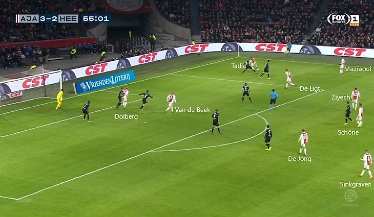 Когда Кик Пири прерывает навес Тадича, девять (!) игроков «Аякса» остаются в атаке. И это при счете 3:2 (!). Все полузащитники, а также защитники (!) де Лигт и Мазрауи заняты в позиционной атаке. В результате чего Блинд и Синкгравен остаются одни против Ламмерса и ван Бергена на огромном пространстве. Преимущество атакующих игроков в скорости в такой ситуации не составило большого труда разыграть.