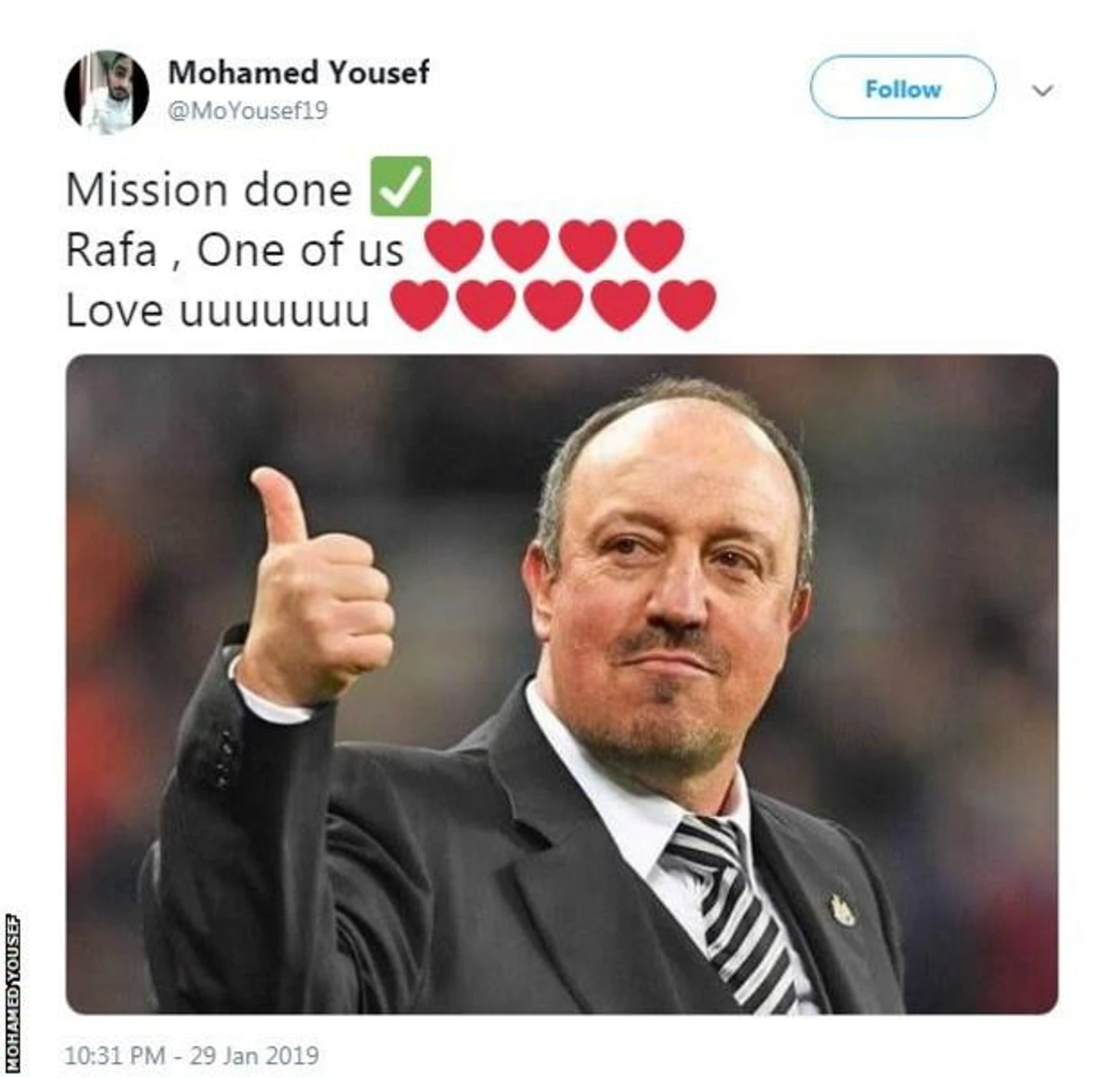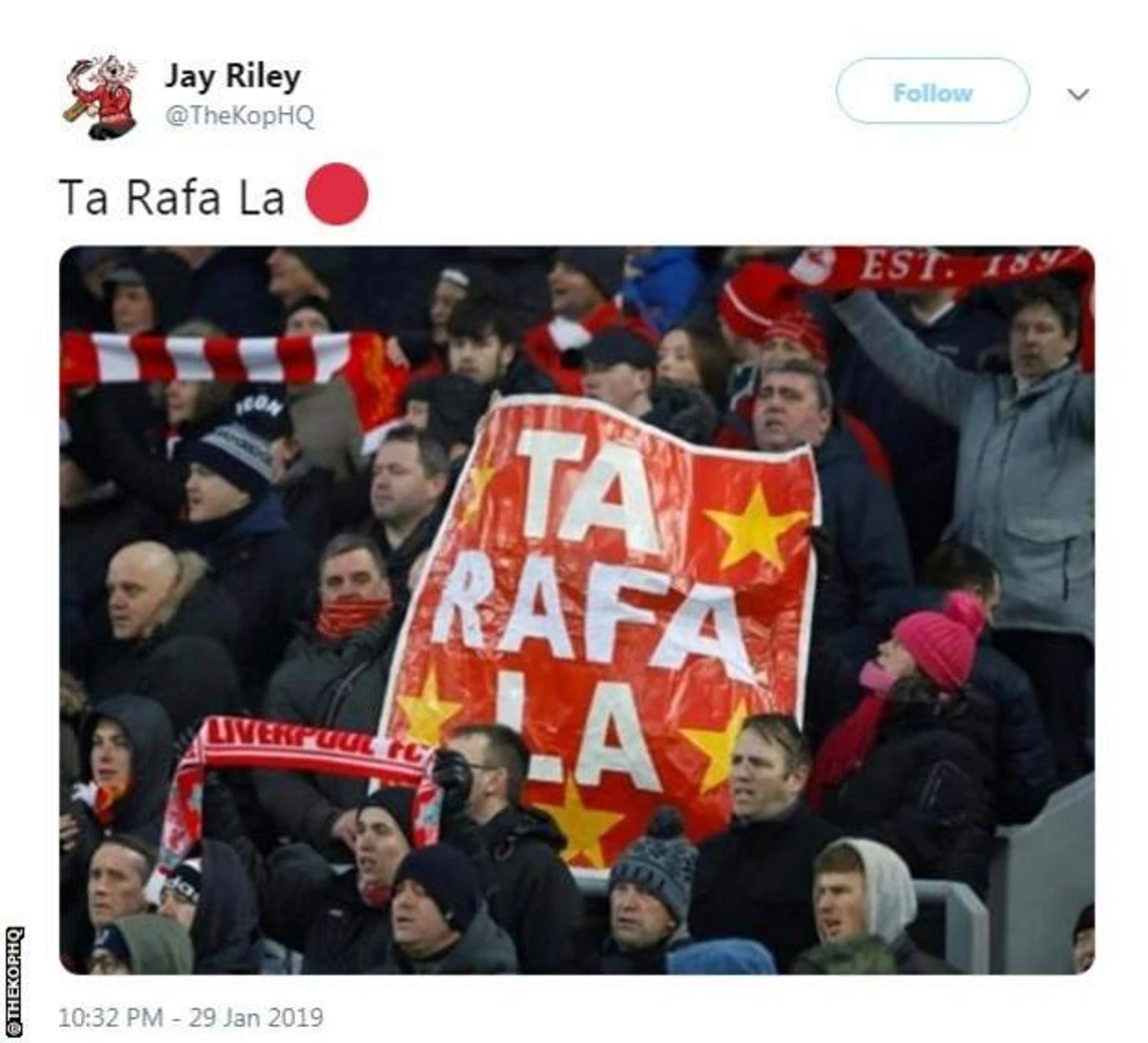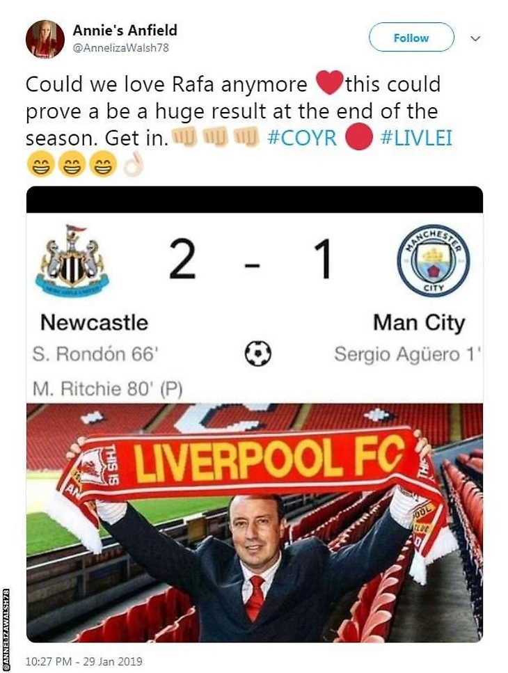 Болельщики Ливерпуля благодарят тренера Ньюкасл Юнайтед Рафаэля Бенитеса за победу в 24 туре АПЛ, которая обеспечила Ливерпулю отрыв от Манчестера Сити в турнирной гонке.