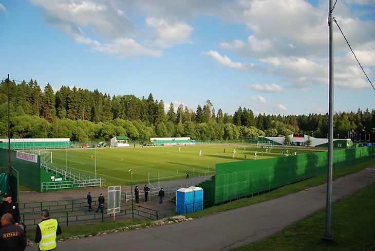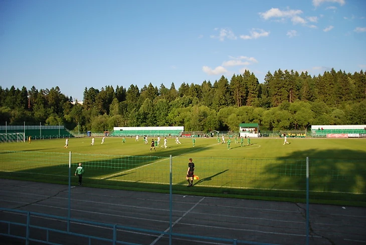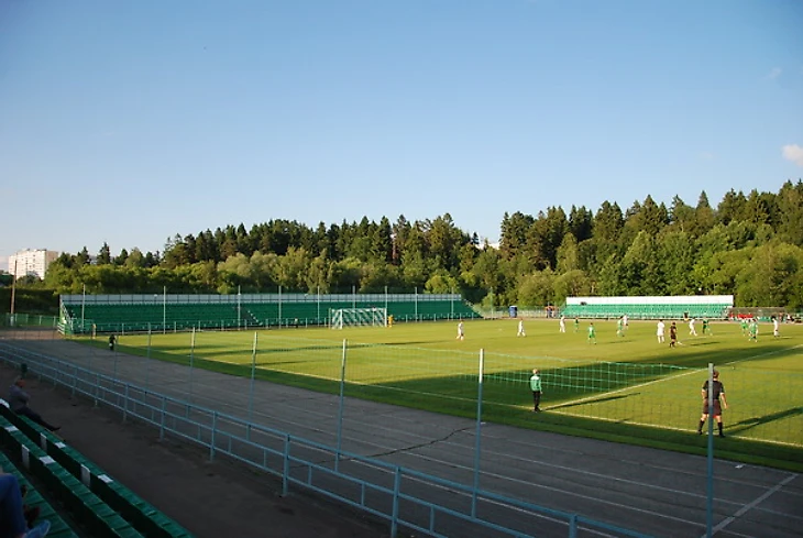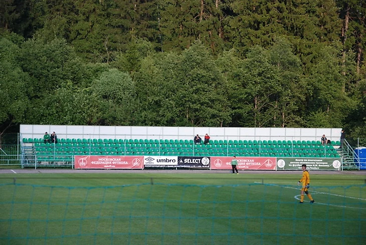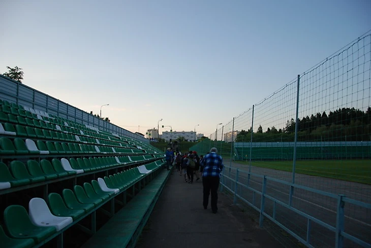 Стадион умеренно радует глаз. Он выдержан в зеленых цветах, что не лишено логики. Трибун целых три. Можно было бы сказать не «целых», а «всего», но по меркам Третьего дивизиона – однозначно «целых». Главная – Западная, вдоль поля, самая вместительная (кстати, не всегда так бывает; например, на стадионе «Янтарь» в Строгино главная трибуна гораздо меньше второй, не главной). На ней на зеленом фоне белыми креслами выложена надпись «ЗЕЛЕНОГРАД». Правда, увидеть эту надпись удалось только на Яндекс-картах с видом из космоса – пофотографировать трибуну не получилось по указанным выше административным причинам.