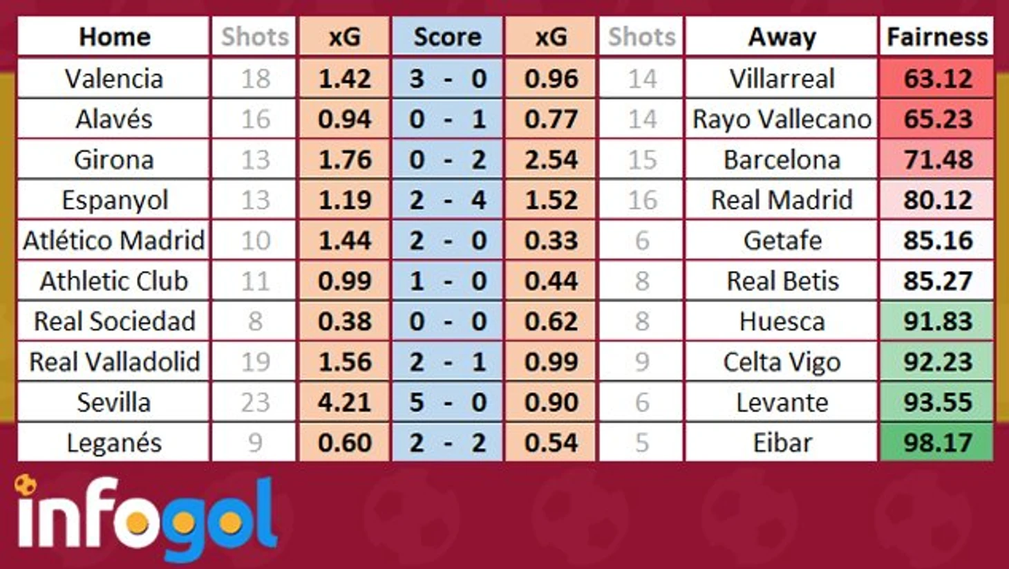 Оценка справедливости результатов 21-го тура Ла лиги от Infogol