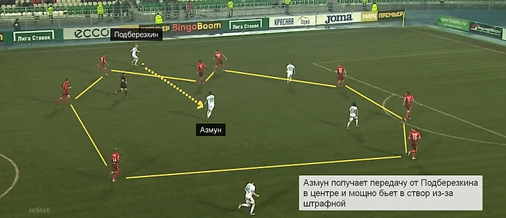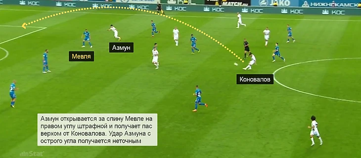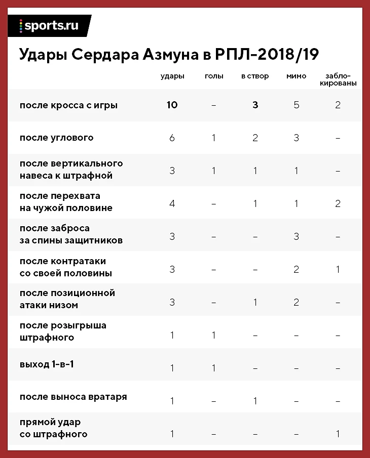 Почти половину ударов Азмун нанес после кроссов и подач с угловых – он действительно качественно борется вверху (7,3 верховых единоборств за 90 минут, 52% успешных), но при навесах и прострелах с игры иранец бьет и правой ногой, играя на опережение (например, в матчах с «Уфой» и «Уралом»).