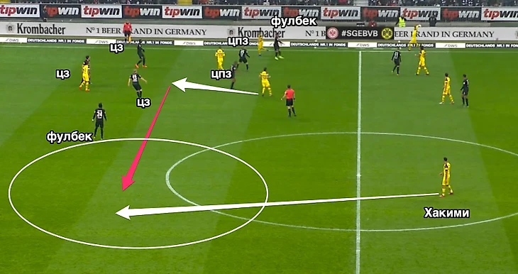 Даже если соперник «Айнтрахта» сходу не прокручивает какую-то комбинацию с аута, все равно остается высокая вероятность в борьбе получить мяч и быстро развернуть атаку на другой фланг, где обычно не остается вообще никого. Пример в матче с «Боруссией», когда Хакими остался абсолютно один на противоположном фланге, показывает то, сколько дополнительных шансов может получить Исмаили, если его партнеры смогут навязать борьбу в подобных ситуациях.