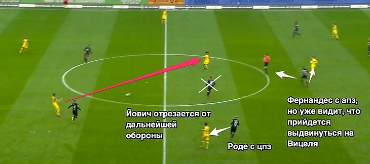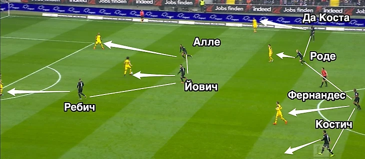 Против «Дортмунда», который, как и «Шахтер», играет по схеме 4-2-3-1, Йович играл по тому опорнику, который располагается немного ниже, а второй опорник и “десята” достаются паре центральных полузащитников «Айнтрахта». Начиная с очень стройной линией полузащиты, Роде и Фернандес ситуативно подстраиваются под передвижения центра полузащиты соперника, опираясь на максимально персонализированный прессинг.