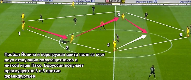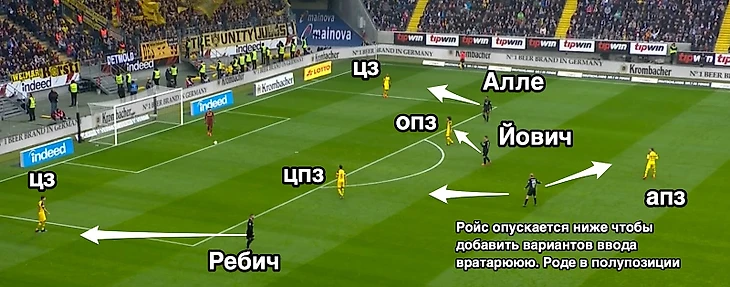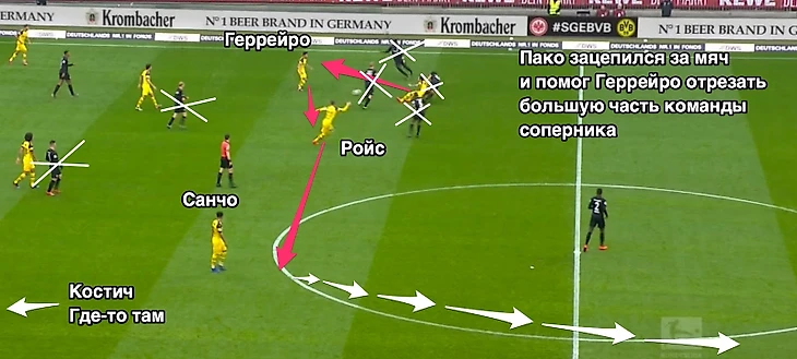 «Боруссия», имея в центре поля 5 человек, умеющих двигать мяч на топовом уровне, за счет перегрузов отдельных частей центра поля очень легко разрывала франкфуртский прессинг и за период с 10 по 30 минуту сумела нанести 6 ударов (2 Пако и 4 Ройс), а Маркой Ройс, не считая своего забитого гола, мог забить еще парочку спокойно. Достигалось это все уже описанным выше элитным движением игроков и высокой скоростью перемещения мяча. По-нормально за этот отрезок «Боруссия» могла похоронить интригу в матче, но франкфуртцы сумели перетерпеть этот отрезок.