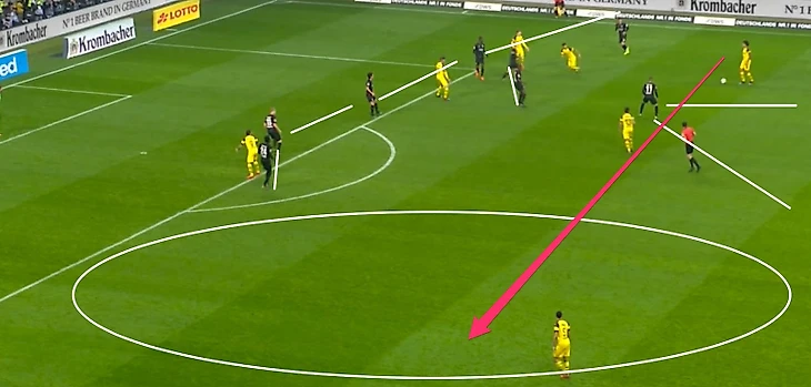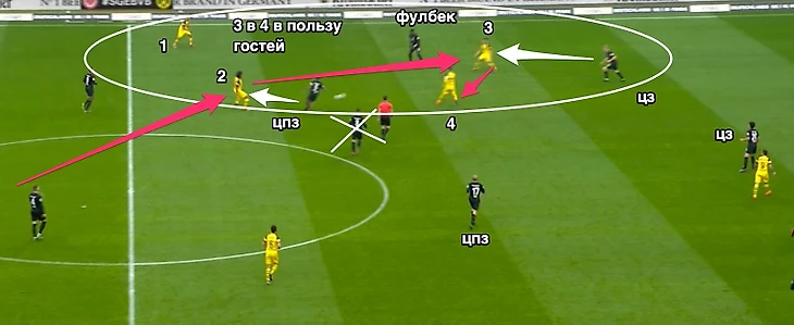 Последние два матча франкфуртцев, особенно против «Боруссии», показали, что прессинг «Айнтрахта» очень далек от идеального. Как и любой персонализированный прессинг, он основывается на том, что каждый игрок твоей команды не должен 1 в 1 проиграть соответствующему сопернику. При отыгрыше хотя бы одного из прессингующих игроков, рушится все конструкция команды и начинается цепная реакция разменов, в которой у соперника в итоге окажется на одного соперника больше на каком-то из клаптиков поля.