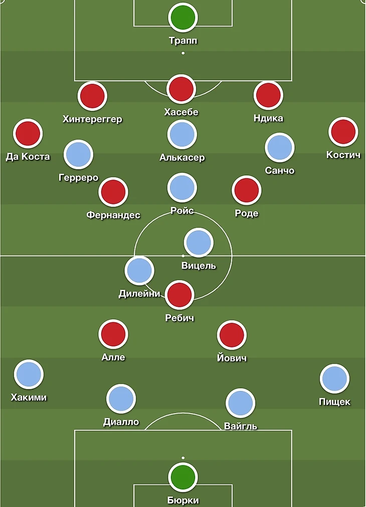 Когда франкфуртцы проигрывают борьбу в центре поля, это превращается в серьезные проблемы, особенно с учетом постоянных походов Костича в помощь к нападающим. Марлос и Тайсон могут наказать немцев не хуже, чем это делали Ройс и Санчо (хотелось бы лучше, Ройс не смог реализовать все свои моменты).