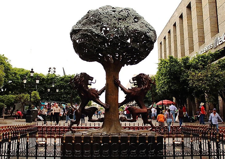 Однако главные элементы сохранились. Важно понимать, что сам герб имеет давнюю историю, которая отсчитывается с указа испанского короля от 1539 года. Вследствие этого многие видят некоторое сходство между современными гербами Мадрида и мексиканской Гвадалахары. Только здесь вместо медведя изображены два льва, означающие храбрость и доблесть конкистадоров, завоевавших эту землю. А традиционное для испанской столицы земляничное дерево заменено сосной. Примечательно, что эта композиция была выполнена в том числе и в виде скульптуры, ныне располагающейся в центре города (на фото).