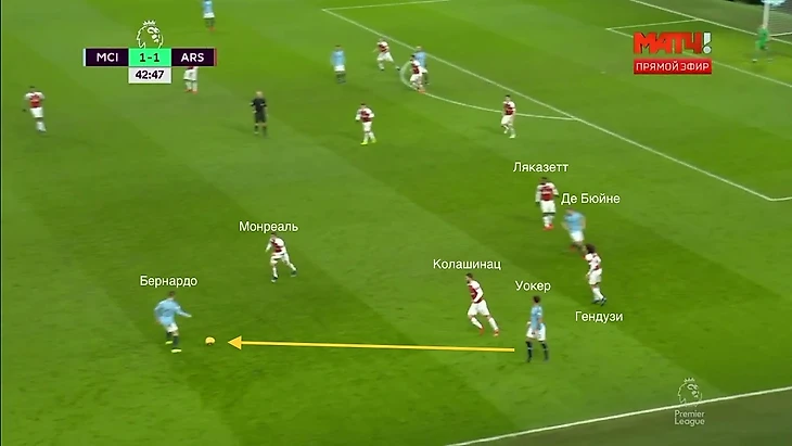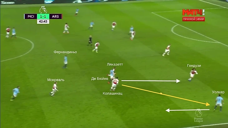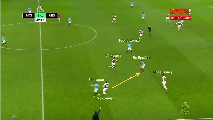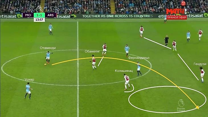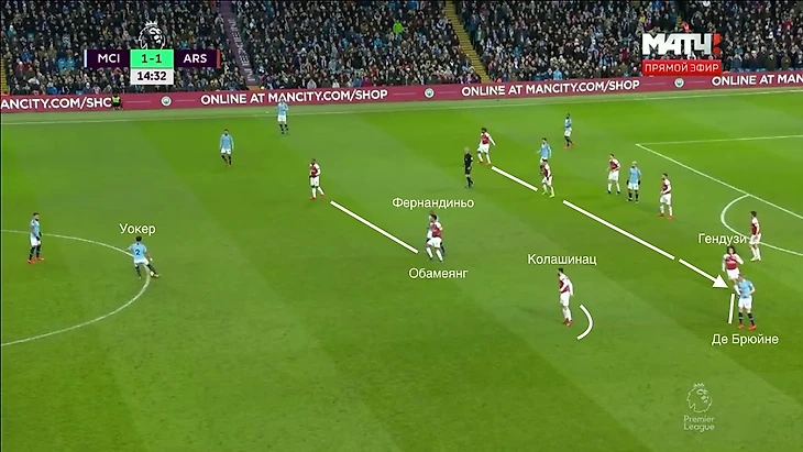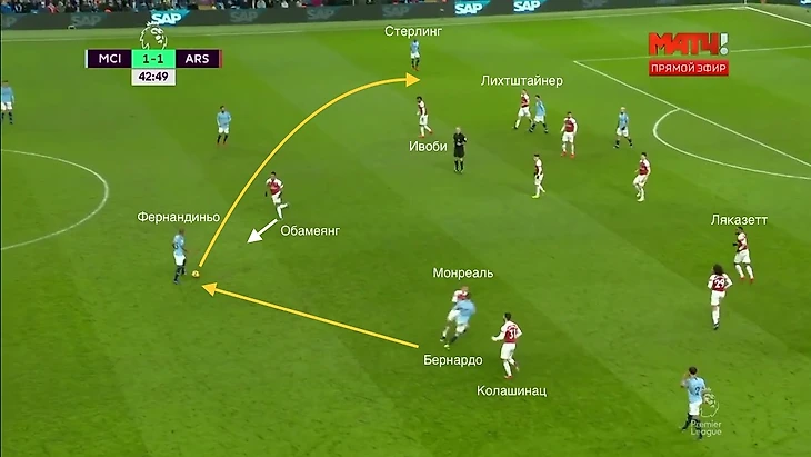 Фернандиньо остается совершенно свободен. По нему должен играть Ляказетт, но он ушел за Де Брюйне. Бразилец делает диагональ на Стерлинга, создавая изоляцию. Обамеянг безуспешно пытается помешать.
