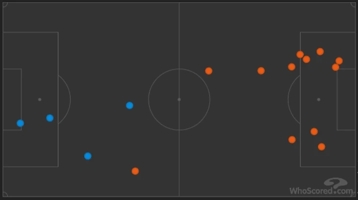 "Сити" делал с флангом все, что хотел. Статистика у нападающих просто отличная. 5/5 обводок у Стерлинга, 4 ключевые передачи, 4 возвращения мяча и ассист. 3/5 обводок у Давида Сильвы, 3 передачи под удар, 4 возвращения мяча. 21 передача в финальной трети поля у Лапорта (так же, как у Стерлинга), 40 передач вперед (больше, чем назад или в сторону в сумме) и голевая передача.