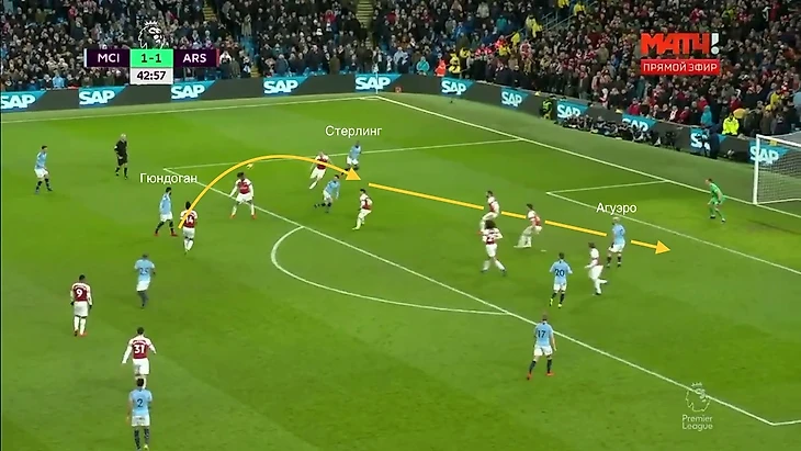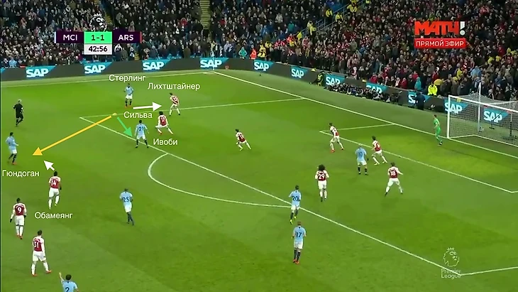 Стерлинг получает мяч и имеет два варианта продолжения атаки. Ивоби закрывает только Сильву. Англичанин отдает на открытого Гюндогана. Обамеянг пытается помешать, но снова не успевает.