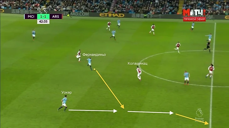 В первом тайме команда Гвардиолы больше использовала левый фланг, а в купе с действиями Колашинаца эта разница была очевидной. В отсутствии Бельерина левый фланг — это самое слабое место в обороне "канониров". Лихштайнер не такой быстрый и резкий, как испанец, и, следовательно, потенциально легкий соперник для Стерлинга и других игроков "Сити".
