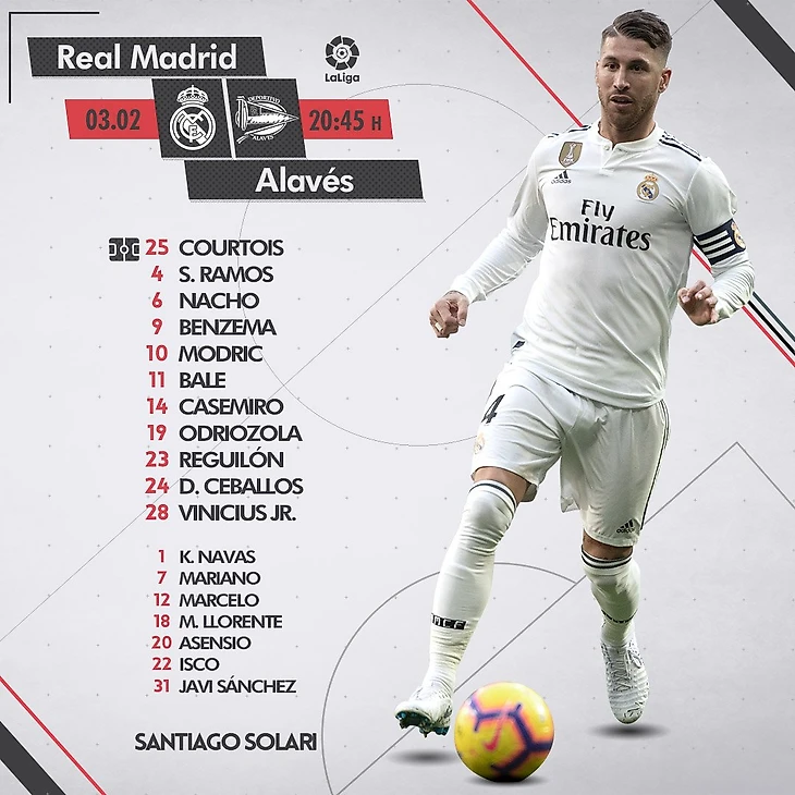 Жеребьевка Кубка Короля внесла коррективы в планы Солари. В матче с Алавесом сразу 4 игрока стартового состава получили отдых по тем или иным причинам. Карвахаль и Варан пропускали матч из-за дисквалификаций. А Лукас и Кроос просто не попали в заявку на матч (Васкес в первоначальной заявке был, но не попал даже на скамейку запасных).