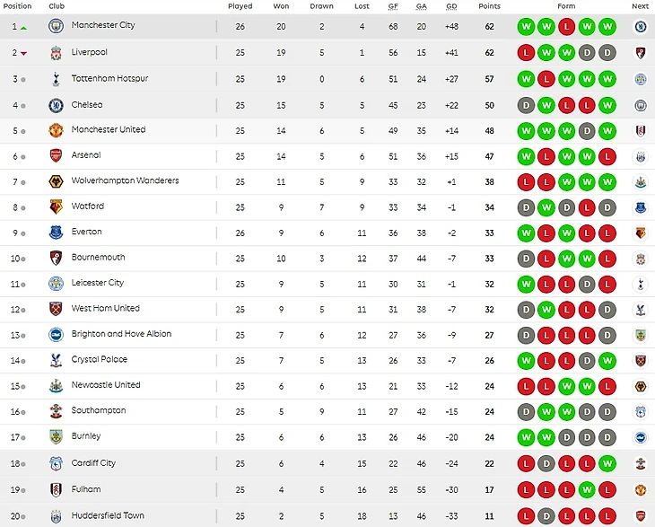 Благодаря осечке "Ливерпуля" и двум матчам в этом туре, "Сити" выходит на первую строчку турнирной таблицы. Давление на мерсисайдцев растет, впереди упорная борьба за титул. Впереди у них еще один важный матч с "Челси", а затем расписание усложнится Лигой Чемпионов. "Манчестер Юнайтед" поднимается на пятую строчку и дышит "аристократам" в спину. "Кардифф" реанимирует борьбу за выживание, а вот "Фулхэм" с "Хаддерсфилдом" пока не могут добиться того же. Спасибо всем прочитавшим.