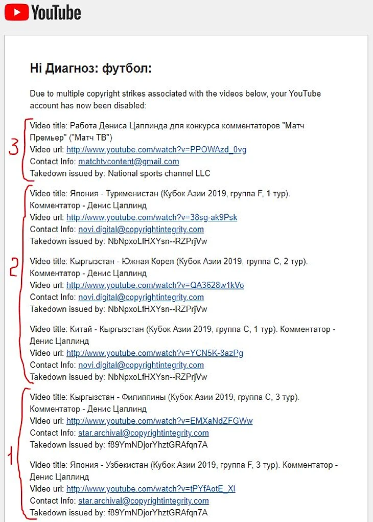 Последняя жалоба пришла от «Матч ТВ» (ООО «Национальный спортивный телеканал»). Пришла на ролик, с которым я участвовал в конкурсе комментаторов «Матч Премьер». Формально «Матч ТВ», разумеется, имел право на такие действия. Но как-то это мелочно срываться на 5-минутный отрывок, озвученный мною, в то время, когда «сопки» бороздят просторы интернета. Ну да ладно, переживём.