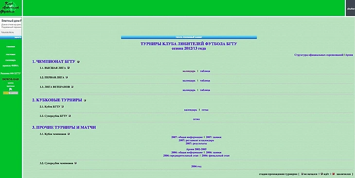 Первый сайт КЛФ БГТУ был создан еще в начале 2000-х годов на сервисе , который потом стал сервисом Яндекса, это были первые попытки освоения интернет-пространства. В те времена активно использовался форум, где можно было не стесняться в выражениях, разговаривая с футбольными товарищами. В основном сайт использовался для отображения расписания и турнирных таблиц, которые собирались вручную: руководство клуба вбивало цифры прямо в html-код.