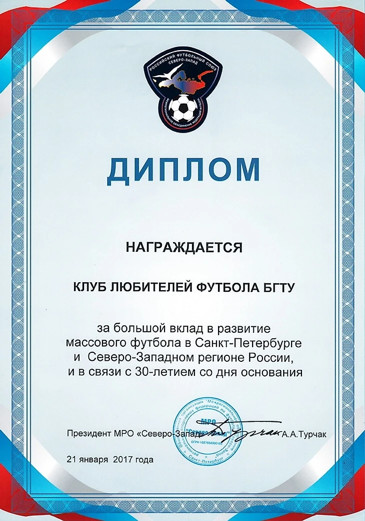 В год 30 летия КЛФ БГТУ был удостоен похвальной грамоты от Президента Федерации Футбола Санкт-Петербурга и МРО “Северо-Запад” Анатолия Александра Турчака. На новый виток вышли отношения с “родным” вузом, проведены были переговоры о взаимной поддержке и сотрудничестве.