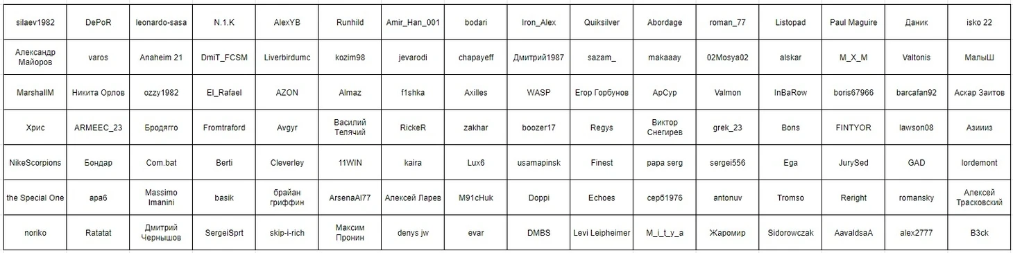 1) Из общего списка записавшихся были извлечены люди, решившие стать капитанами команд. Вот эти 16 человек: silaev1982, DePoR, leonardo-sasa, N.1.K, AlexYB, Runhild, Amir_Han_001, bodari, Iron_Alex, QUIKSILVER, Abordage, roman_77, Listopad, Paul Maguire, Даник, isko 22.