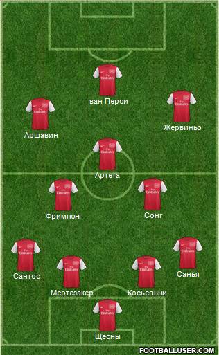 "Арсенал" (4-2-3-1): Щесны - Санья, Косьелни, Мертезакер, Сантос - Фримпонг, Сонг, Артета - Аршавин, Жервиньо, ван Перси.