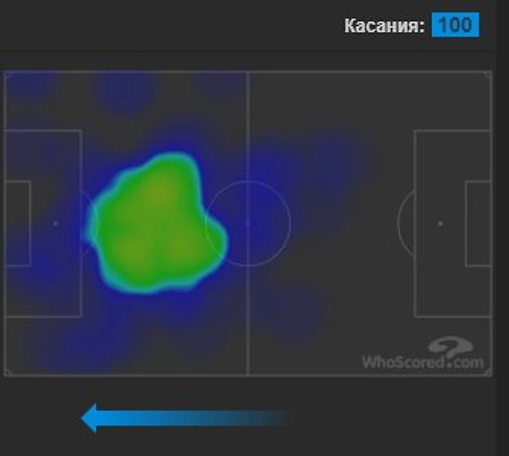 Месси находится на позиции правого форварда только в расстановке, которую рисуют телевизионщики. Сегодняшняя позиция Лео — скорее гибрид восьмерки и десятки. Аргентинец очень часто начинал атаки из центрального круга и выступал в роли разыгрывающего. Об этом говорит и количество касаний мяча (100) и средняя позиция по тепловой карте. Правым флангом тут и не пахнет: