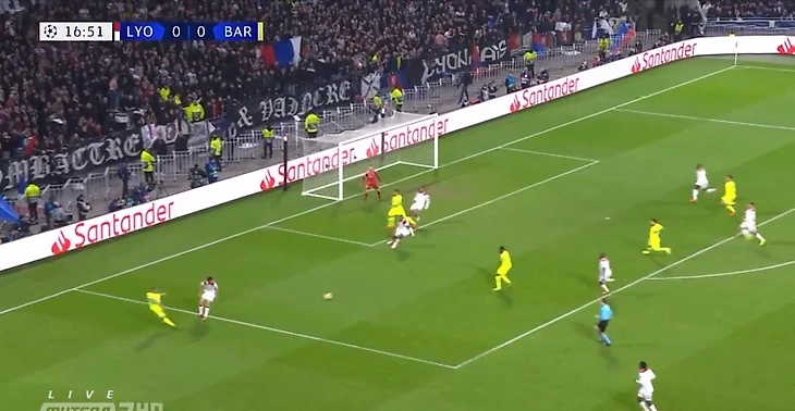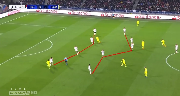 9 из 10 футболистов «Лиона» находятся за линией мяча. В оборону ушел даже Мемфис Депай. Игроки французского клуба выстроились в две линии — в одной 4, в другой 5 человек. Обращаем внимание, что играет «Лион» достаточно узко. За пределами кадра находится свободный Жорди Альба — ему и будет адресована передача Лео.