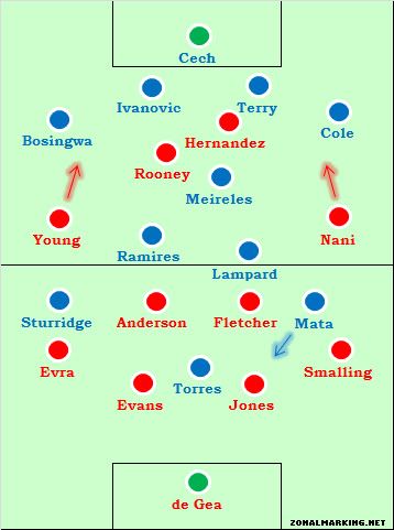 2. Когда "Юнайтед" играл 4 матча против "Челси" в прошлом сезоне, все говорили о том, что "синим" необходим игрок, способный следовать по пятам за Уэйном Руни на протяжении всей встречи, - когда Руни опускается ближе к средней линии, он представляет повышенную угрозу для ворот соперника. Андре Виллаш-Боаш не настолько наивен, чтобы играть без опорного полузащитника, из-за чего он и выпустил на эту позицию Рауля Мейрелеша. Португальский хавбек достаточно функциональный футболист, в общем-то подходящий для роли опорника (одно из главных его достоинств заключается в умении, что называется, "отпахать"; трудно сказать, к исполнению каких именно компонентов футбольного мастерства относится данная характеристика), но только не тогда, когда против него играет Руни. Возможно, разумнее было бы выпустить в старте Джона Оби Микела.