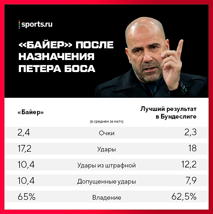 Бос говорил, что извлек уроки из того провала. А «Байер» точно знал, кого приглашал. «Петер выделяется за счет атакующего привлекательного футбола. У нас куча игроков, которые подойдут такому стилю», – рассказывал спортивный директор клуба Симон Рольфес. Тезис про игроков – чистая правда. Вероятно, в Леверкузене у Боса получится лучше.