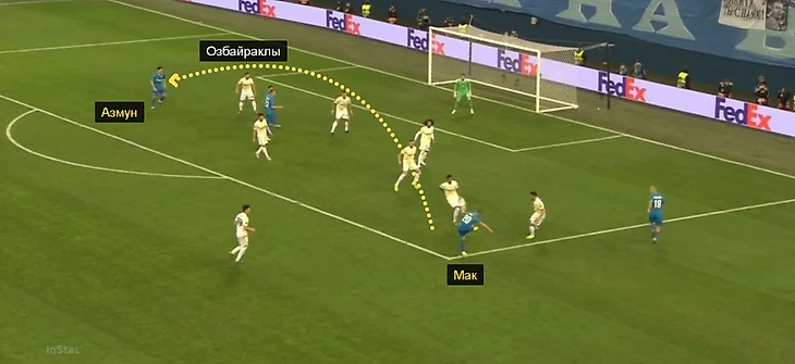 5. Ключевое решение Семака – позиция Азмуна при навесах. Новичок «Зенита» нанес 6 ударов (больше всех в матче), 3 – головой (у Айю – 1). Один удар Азмун нанес из центра штрафной после подачи Смольникова от лицевой на 11 метров. В остальных случаях Сердар располагался с крайним защитником «Фенербахче».