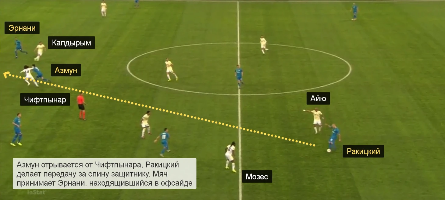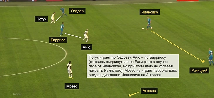 Освобождать Ракицкого из-под давления «Зениту» удавалось и за счет Барриоса, который опускался на одну линию с центральными защитниками для розыгрыша. Мозес вообще не шел на Ярослава при передаче на него – по Ракицкому всегда дорабатывал Айю, который физически не успевал сблизиться с соперником вовремя.