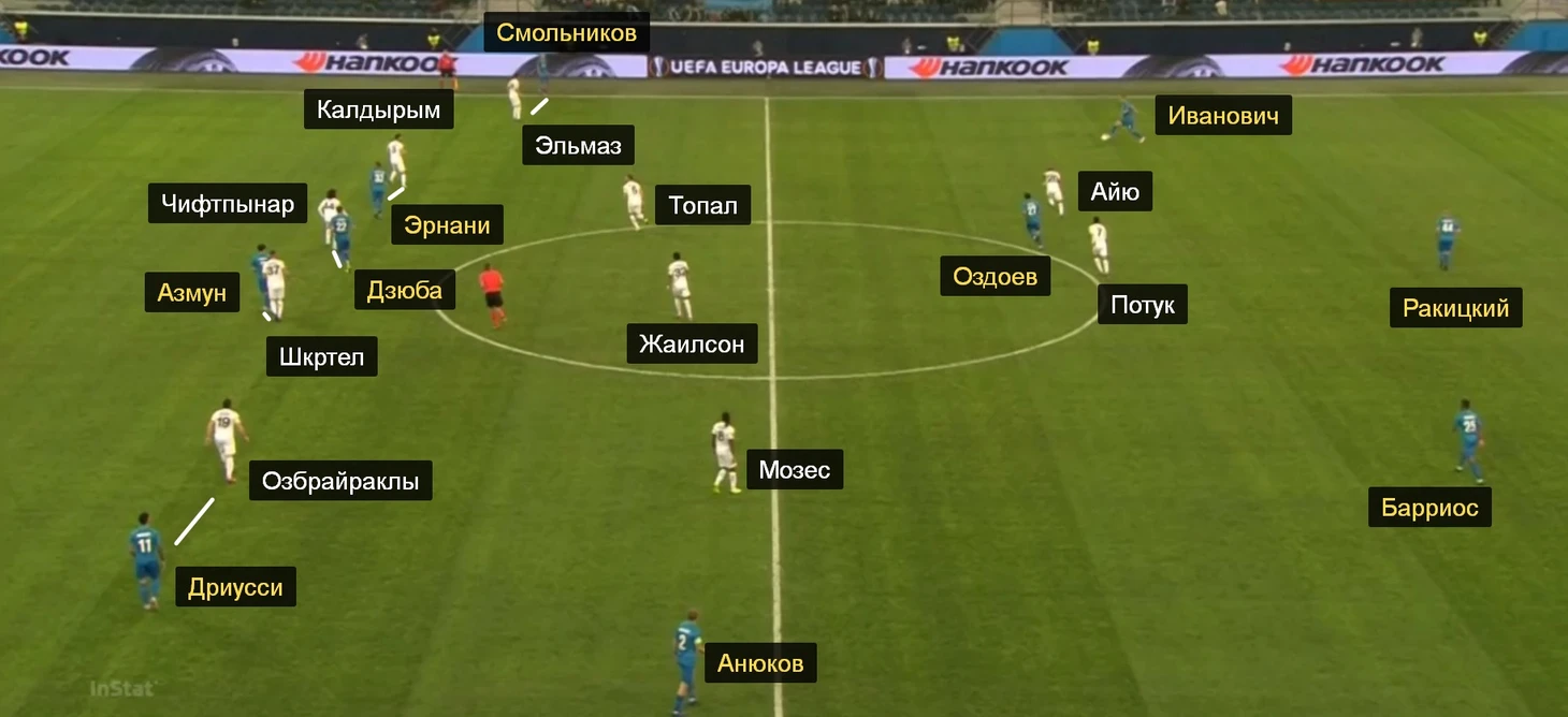 Ожидалось, что Семак выпустит в старте Азмуна (в паре с Дзюбой), переведет Дриусси налево и отправит Эрнани в середину, посадив Краневиттера в запас. Получилось немного по-другому: Азмун действительно появился с первых минут, Дриусси ушел на фланг, но в середине рядом с Барриосом вышел Оздоев, а Эрнани отправился направо.