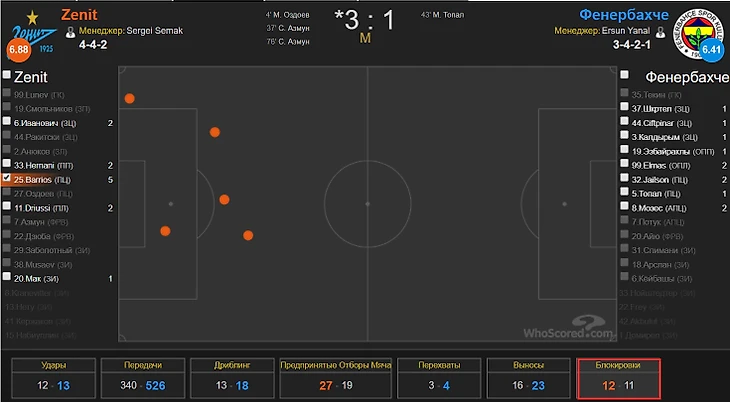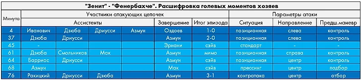 Кроме того, в плане общекомандного созидания (7 моментов/6 игровых) этот матч стал для «Зенита» лучшим с конца сентября, когда в Астрахани был обыгран «Волгарь» (10/8).