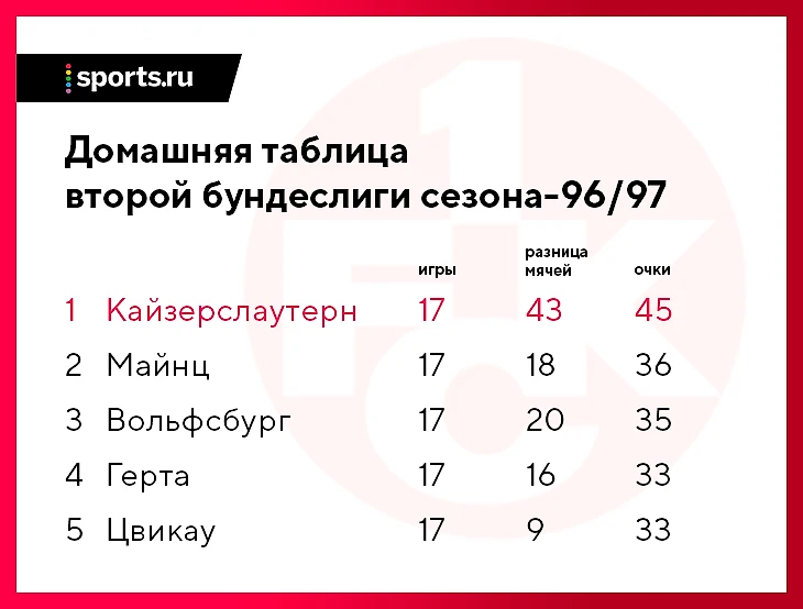 «Кайзерслаутерн» за весь сезон ни разу не проиграл дома (14 побед) и в среднем забивал на «Фритц-Вальтер-Штадионе» 2,5 гола за игру.