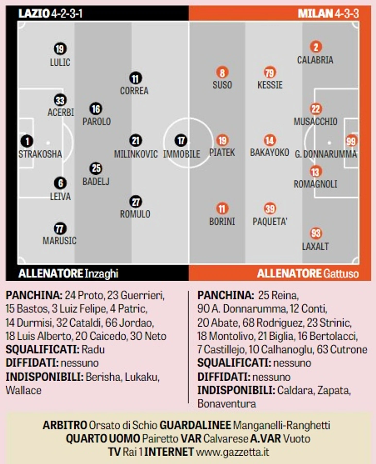 В составе "Лацио" наблюдается, бросающийся в глаза, дисбаланс, и тренер объявил об основной задаче на матч против "Милана". Цель : контроль мяча, аккуратные действия в обороне, игра в короткий пас. Причиной такого замысла Симоне назвал особую опасность, которую представляет контратака красно-чёрных. Индзаги ,как любой уважающий себя и соперника наставник, напомнил о том, что как бы не завершился вечерний матч, у его клуба всё равно будет второй шанс на "Сан-Сиро".