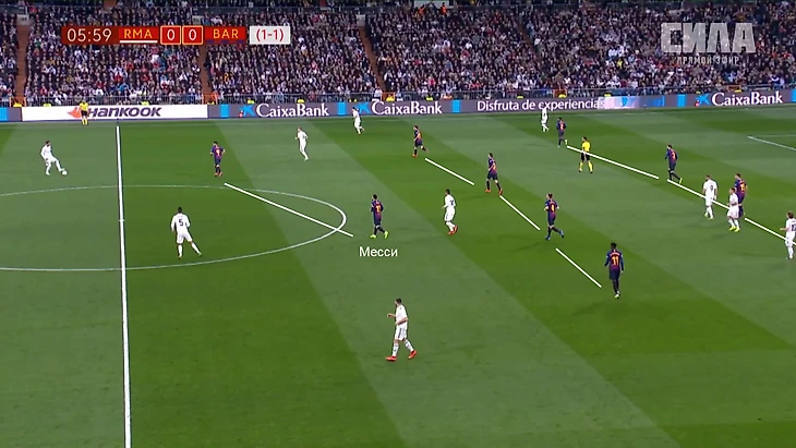5. Когда мяч был у «Барсы», Роберто все-таки становился одним из трех центральных полузащитников. Это давало команде перевес в центре поля. Каземиро почти всегда следил за Месси; Тони Кроос и Лука Модрич оказывались в меньшинстве: