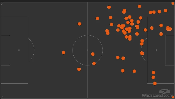 10. После пропущенного мяча «Реал» переключился на позиционные атаки. В затяжных розыгрышах команда Солари явно делала упор на левый фланг. Вот карта передач «Мадрида» на чужую треть с 50-й до 70-й минуты: