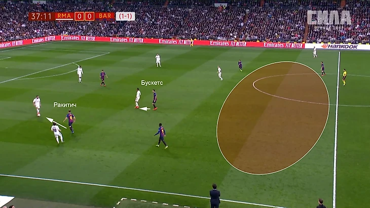 Бускетс и Ракитич выдвигаются очень высоко, но линия защиты их не поддерживает (вероятно, опасаются дальнего паса на быстрого Жуниора). Результат – дыра в опорной зоне, которую «Мадрид» использует после прохождения первой волны: