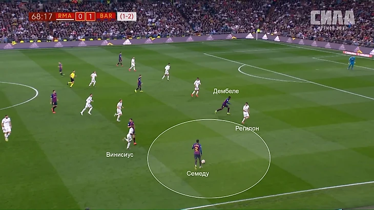 Но «Реал» снова ничего не реализовал, за что «Барса» хладнокровно его наказала. Второй гол гостей случился именно за счет открытости левого фланга «Реала». Винисиус с опозданием оказал давление на Семеду, Регилон разрывался между выдвижением на Семеду и игрой против Дембеле: