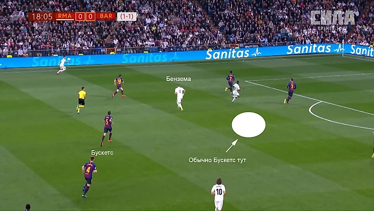 Обычно в таком эпизоде Бускетс располагался бы в центре опорной зоны и прочитал бы любое действие Бензема после получения мяча. Сейчас Бускетс слишком высоко из-за схемы и вынужден возвращаться – не успеет: