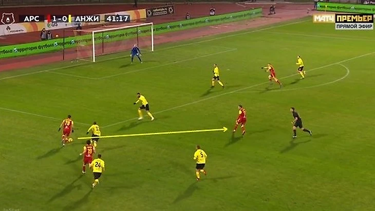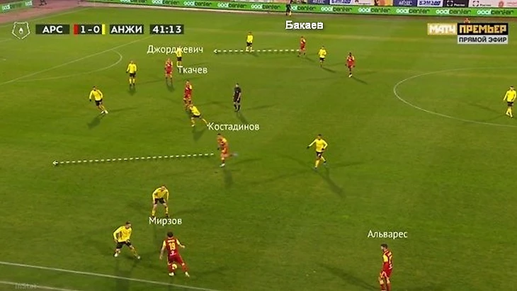 "Арсенал" готовит атаку через левый фланг. Мирзов стягивает на себя двух футболистов соперника, Костадинов врывается в свободную зону и получает мяч. Обратите внимание на Ткачева и Бакаева.