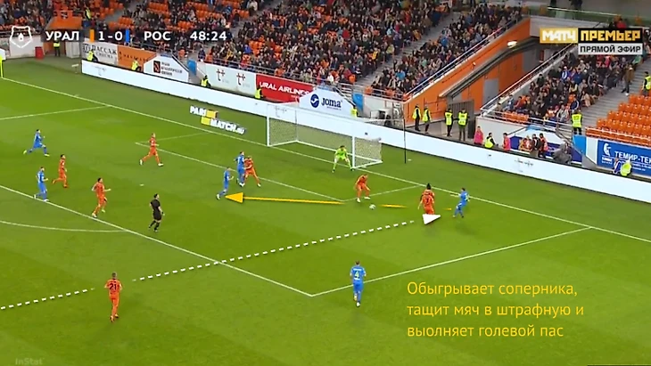 Надо понимать, что это изначально полузащитник вне системы, который плохо держит зону и не обладает сумасшедшими данными на мяче. Он берет за счет включения вторым темпом и понимания позиционной игры в атаке, но проваливается в прессинге и не способен вскрывать низкий блок через ведение мяча и проникающих передач, начиная атаки из глубины или во второй трети.