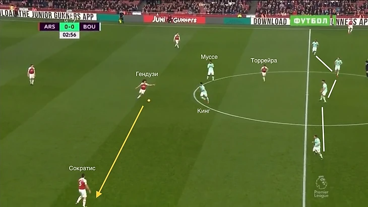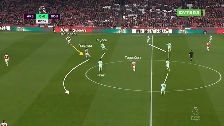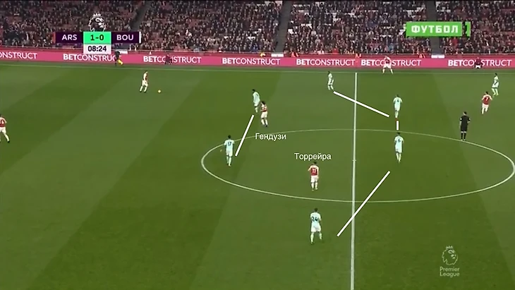 "Арсенал" прессинговал стандартно: не очень активно, но уже куда более организованно чем раньше. Первая линия прессинга – тройка нападения, плюс страховка и подключения от Торрейры и Гендузи. В статичных ситуация к прессингу подключались и крайние защитники.