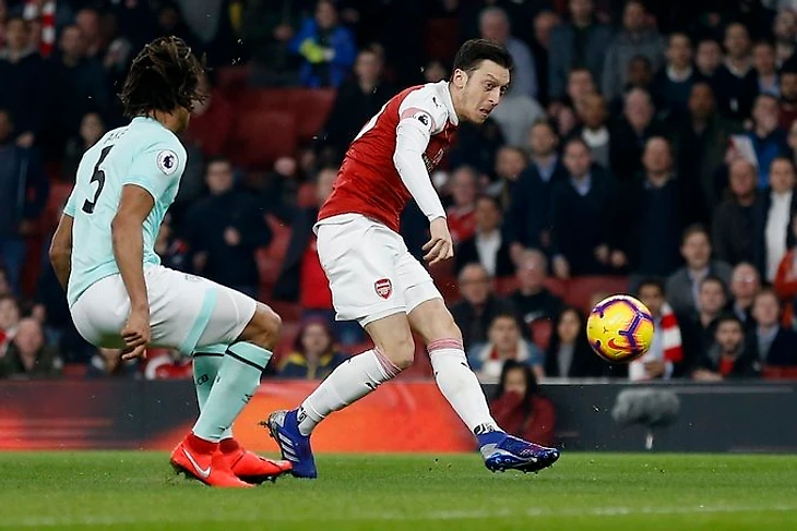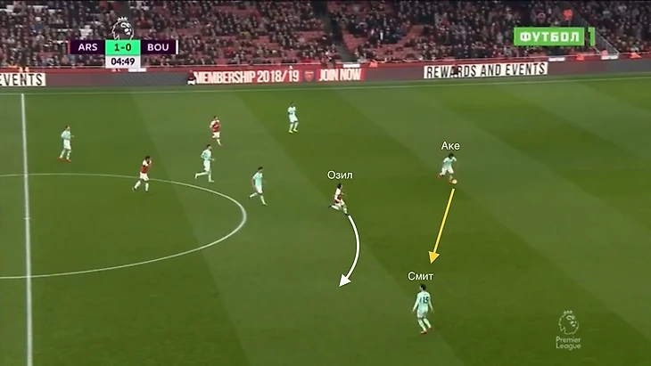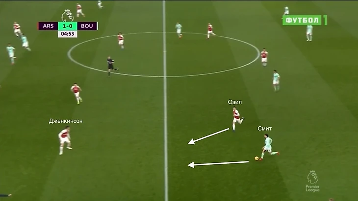 Озил из центра поля уходит на фланг, успевая и за Смитом, и за мячом.