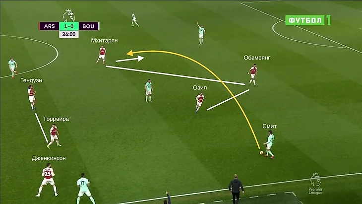 Смит выполняет перевод на противоположный фланг, но не точно. Мхитарян перехватывает передачу. "Арсенал" забьет второй гол.
