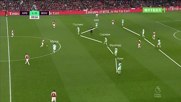 Еще провальнее план сделало то, что за спинами высоко поднимающихся Сермана и Гослинга открывались Озил и Мхитарян. Они получали слишком много свободы, а линия обороны "Борнмута" на поднималась выше и не страховала полузащиту. Может быть из-за Обамеянга, может быть по ошибке.