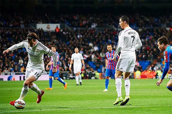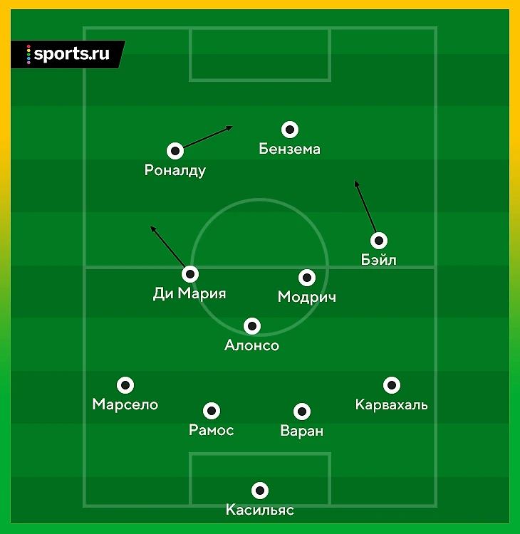 Без мяча команда располагалась 4-4-2 с Бэйлом и Анхелем Ди Марией на флангах. С мячом схема трансформировалась в 4-3-3 – Гарет становился частью атакующей тройки. Роналду чаще, чем раньше, оказывался в штрафной. Бэйл глубже оборонялся и был важным связующим звеном при контратаках. «Да, мне нужно много обороняться. Когда мы атакуем я нахожусь около Криштиану и Карима, но когда мы в защите, я помогаю полузащите. В этом моя роль», – объяснял Гарет.
