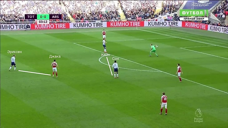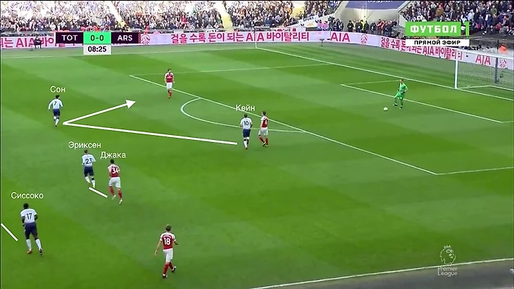 Команда Почеттино прессинговала по схеме 2-1-2, где Кейн и Сон размещались в полуфлангах, Эриксен имел персональную ориентировку по самому низко располагающемуся опорнику (чаще всего Джака), а Ваньяма и Сиссоко занимались подстраховкой датчанина. Ситуативно кто-то из них мог накрывать крайнего защитника, а другой, например, второго свободного опорного "Арсенала".