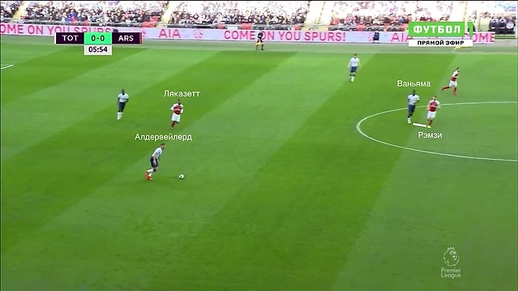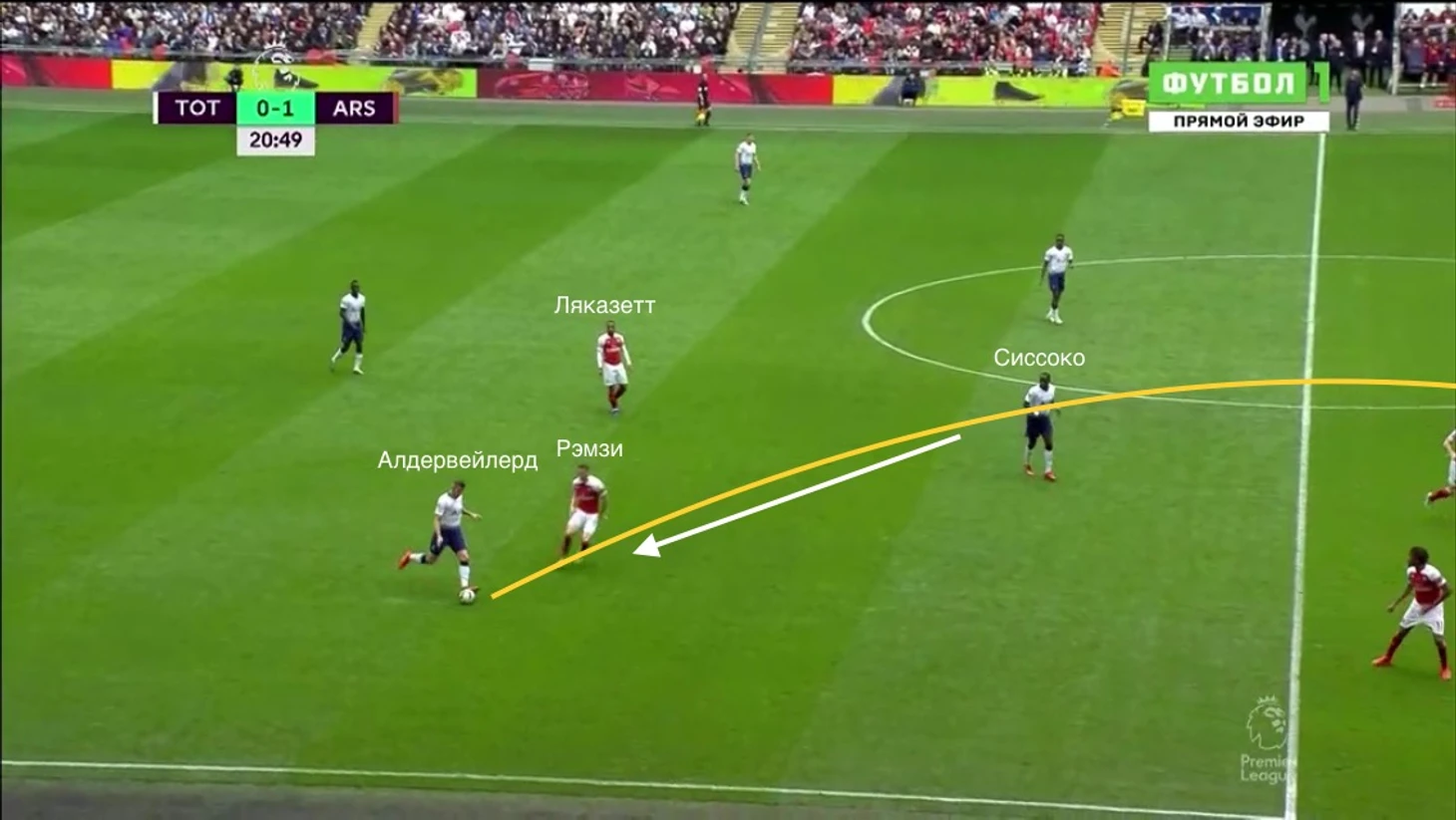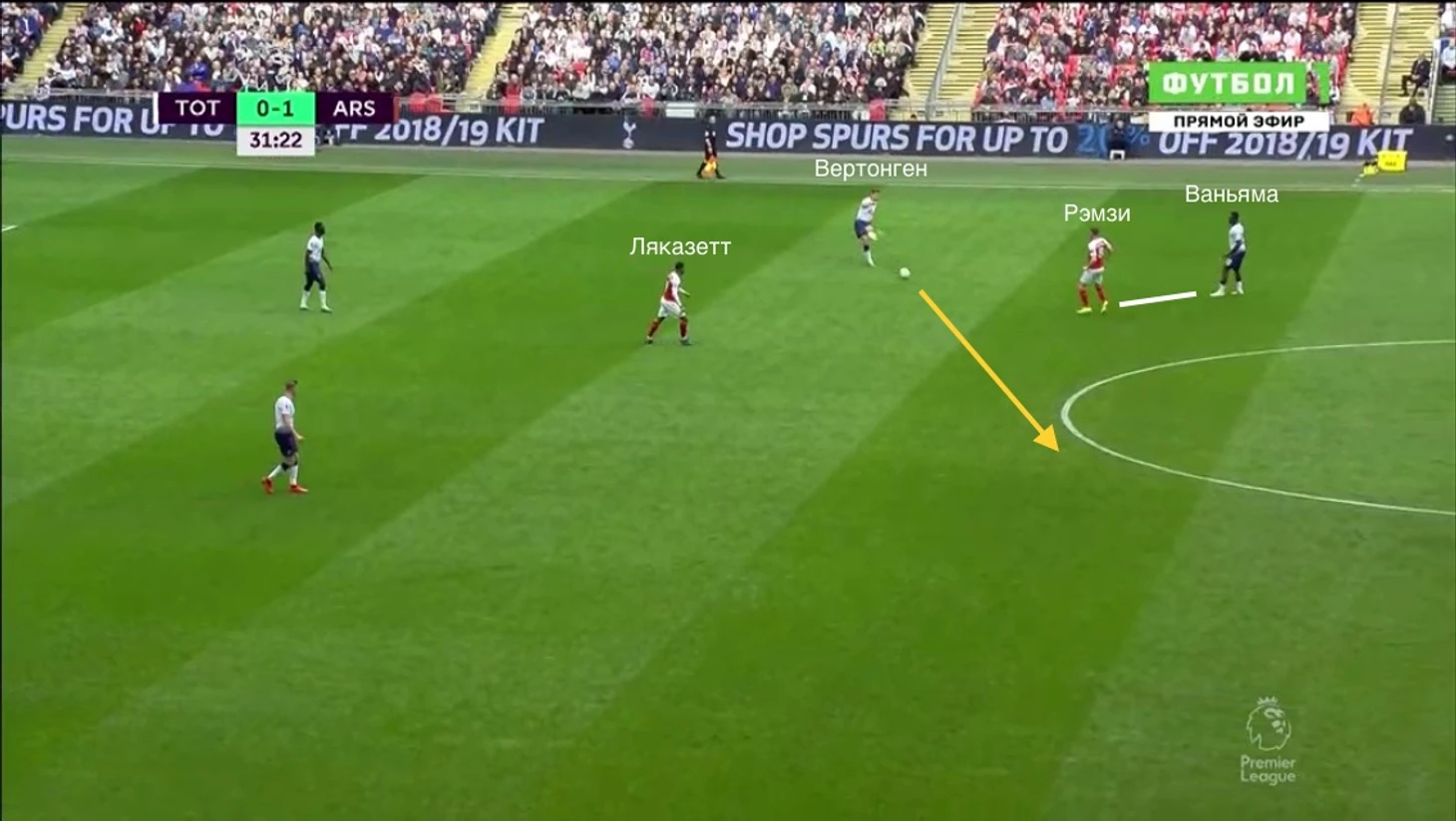 Обычно команда либо агрессивно прессингует большим числом (а в начале сезона еще и безструктурно), либо не прессингует совсем, сохраняя плотность и схему в позиционной обороне, как это было против "Сити". В этот раз "Арсенал" встречал соперника достаточно высоко, но не большим количеством. Прессинговать центральных защитников и вратаря уходил только Ляказетт, а крайние полузащитники, Ивоби и Мхитарян, контролировали крайних центральных защитников и латералей хозяев. Особая роль была отведена Аарону Рэмзи. Валлиец имел персональную ориентировку на разыгрывающего полузащитника "ТТХ", в этом матче это был Ваньяма. Если же центральные защитники хозяев долго владели мячом, то Аарон и сам мог выдвинуться вперед.