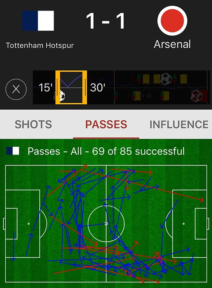 Для сравнения, рядом карта передач в последние 15 минут. Разница очевидна. За этот отрезок хозяева просто смяли команду Эмери. "Тоттенхэм" выиграл по ударам 8:1, 2:1 в створ, 83 передачи против 24 и 35:7 по пасам в атакующей трети, 7:1 по подачам и 1:0 по явным голевым моментам. Конечно, на это повлиял не только более удобный билд-ап, но и тот факт, что на группу прессингующих игроков накатилась усталость. На этом отрезке "Арсенал" не пропустил только из-за Бернда Лено, которой дважды выручил в одном моменте.