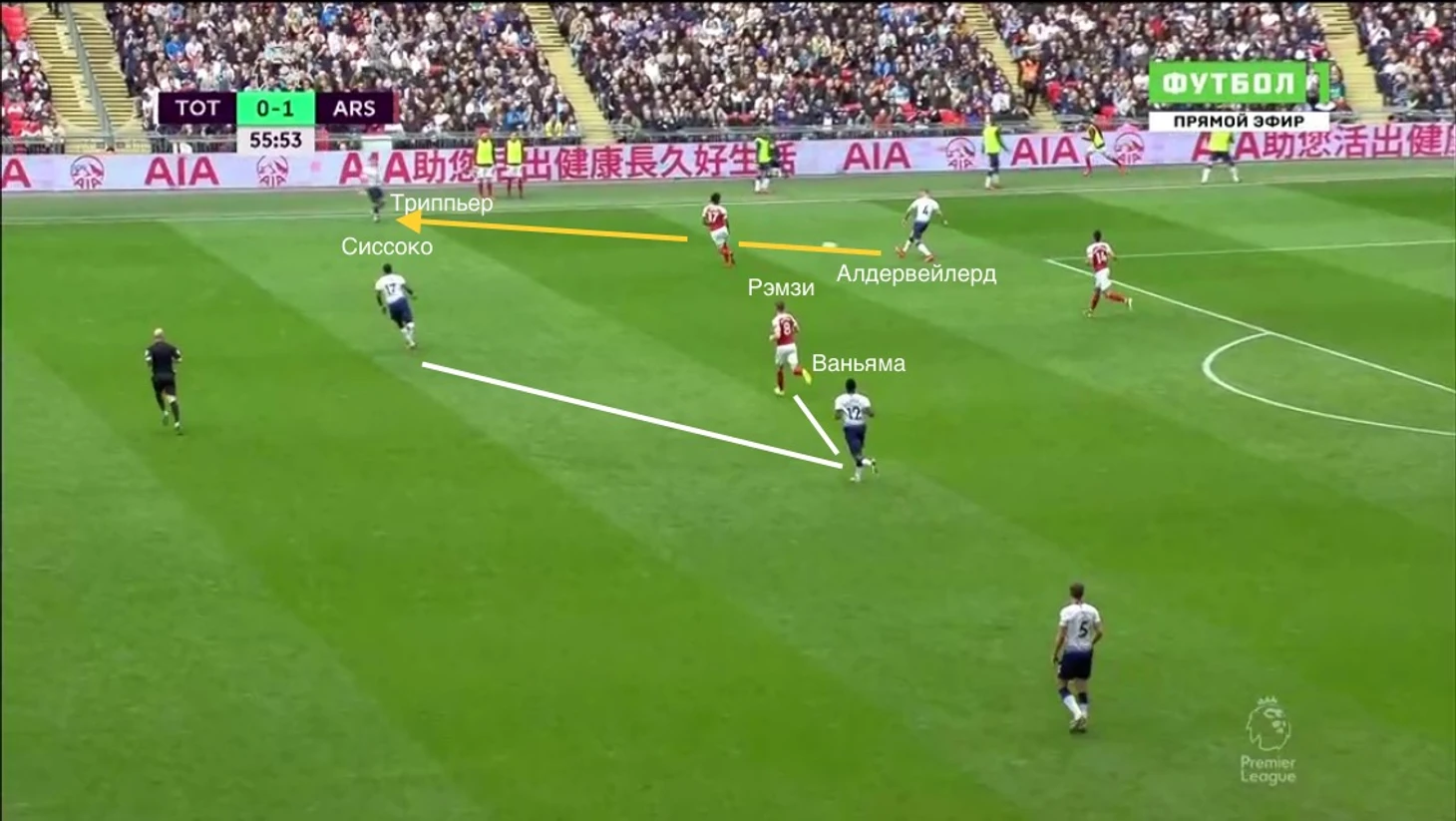 При билд-апе в пару к Ваньяме просто стал опускаться второй центральный полузащитник – Сиссоко. Рэмзи не мог контролировать сразу двух соперников, и у хозяев всегда был свободный вариант для передачи.
