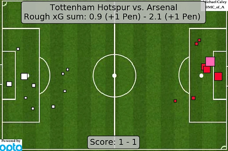 Для наглядности – xG-карта от Майкла Кайли. Она подходит нам по двум пунктам: 1) расчеты Кайли основаны на методах Opta; 2) Кайли всегда отдельно отмечает пенальти – они не учитываются в общей сумме. Здесь это гол Кейна и нереализованный пенальти Обамеянга (как и добивание сразу после) – два эпизода, рожденные после крайне спорных судейских решений.