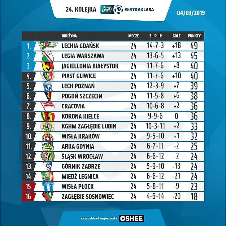 Завершался тур матчем в Любине, где местный «Заглембе» принимал лидера Экстракласы. Уже на 3-ей минуте обычно надежная оборона гданьчан начала давать первые сбои. неразбериха в штрафной гостей чуть было не закончилась голом, но Филип Младенович успел выбить мяч из штрафной. На 17-ой минуте любинцам пришлось делать первую замену. Филип Ягелло, который летом переедет в «Дженоа» получил повреждение и вынужден был покинуть поле. Но и без Ягелло любинцы сумели выйти вперед. На 26-ой минуте быстрая контратака хозяев завершилась падением Слиша в штрафной Куцьяка. К мячу подошел Стажиньски и переиграл словацкого кипера «бело-зеленых». Ошибалась в этом матче оборона не только «Лехии», но и «Заглембе». Одна из таких ошибок привела к удару Пайшау практически по пустым воротам, но удар португальца заблокировал защитник любинцев Копач. До перерыва, однако, свой мяч гданьчане забили. Подача с левого фланга завершилась скидкой Собьеха, которую замкнул Кубицки. Ярослав только летам перешел из родного «Заглембе» в «Лехию». В перерыве у гостей на поле появился Хараслин, который пропустил старт второй части сезона из-за травмы. Выход словака добавил активности на левом фланге гданьчан, где и без словака бегал активный Младенович. Во втором тайме серб мог вывести гостей вперед, но Хладун сумел справиться с ударом Филипа, а Пайшау ударом через себя пробил выше перекладины. «Лехия» начинала давить и моменты все чаще возникали у ворот хозяев. Очередная подача с угла поля закончилась опаснейшим ударом Собьеха, который угодил в защитника «оранжевых». «Заглембе» пытался выстроить игру на контратаках, но толку было мало. Разве что Стажиньски мог оформить дубль, но пробил совсем мимо. У гостей еще несколько моментов упустил Пайшау. А на 82-ой минуте любинцам наконец-то удалась контратака. Павловски сделал великолепную передачу в штрафную на Бохара, а словенец во второй раз вывел свою команду вперед в этом матче. В концовке встречи гданьчане изо всех сил пытались вырвать хотя бы ничью, снова в роли наконечника атак выступал Пайшау, но это был не лучший матч в исполнении португальца. Уже в добавленное время Пайшау упал в штрафной хозяев, однако арбитр не заметил нарушения правил. Не заметили его и судьи на VARе, хотя казалось, что у Стефаньского были все основания, чтобы назначить пенальти. Гданьчане прерывают свою 13-матчевую беспроигрышную серию и впервые за восемь матчей пропускают больше одного мяча. Однако, осечки варшавян в двух предыдущих турах позволяют «бело-зеленым» сохранять за собой первую строчку с отрывом в 4 очка.